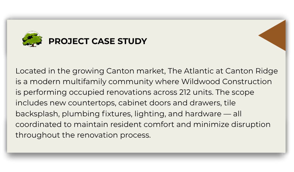 Wildwood Construction is performing occupied renovations across 212 apartment units at The Atlantic at Canton Ridge, a modern multifamily community in the growing Canton market. The scope includes new countertops, cabinet doors and drawers, tile backsplash, plumbing fixture upgrades, lighting, and hardware replacements, all designed to elevate interior quality and resident experience.
